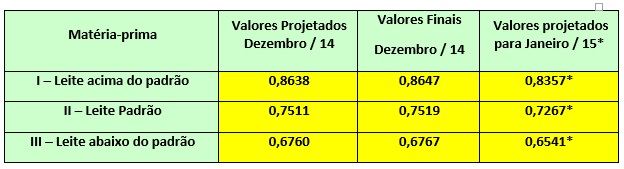 Tabela 1. Projeções dos preços pagos ao produtor para os meses de dezembro/2014 e janeiro/2015 e preço pago ao produtor em dezembro/2014.