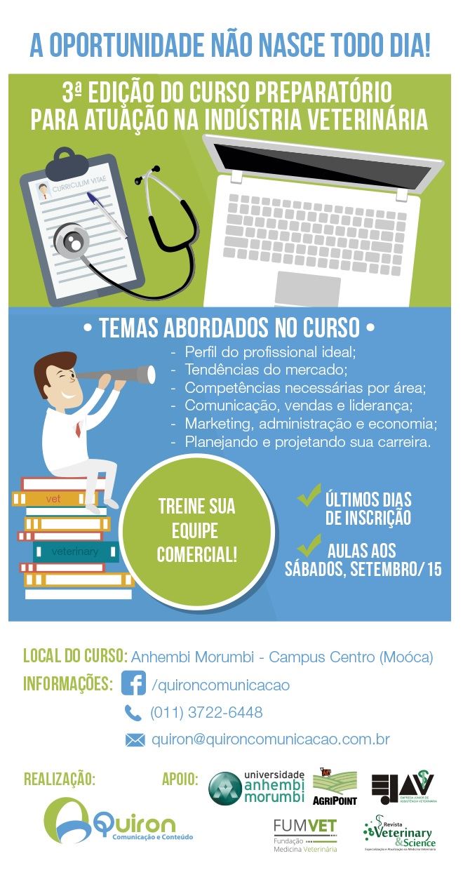 Ao identificar essa lacuna, a Quiron Comunicação e Conteúdo, uma empresa que trabalha em parceria com empresas veterinárias há 13 anos, realiza a 3º edição do Curso Preparatório para Atuação na Indústria Veterinária e Agronegócio. Segundo o médico veterinário Ricardo Oliveira, diretor presidente da Quiron, professor universitário e doutorando em marketing pela ESPM, as empresas encontram grandes dificuldades na hora de contratar jovens para ocupar cargos de chefia. “Os gerentes e diretores costumam nos dizer que o profissional sai muito cru da faculdade, e que são poucos os que se destacam para trabalhar como executivos”.