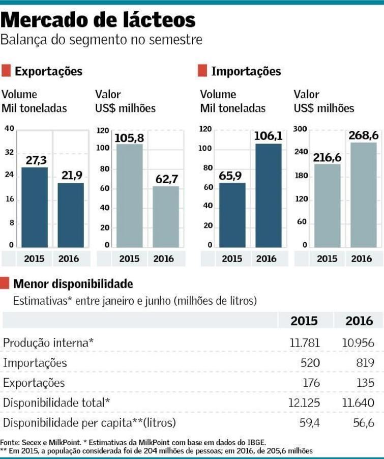 Considerando os volumes comercializados em equivalente leite, o déficit na balança também cresceu. Conforme o MilkPoint, no primeiro semestre, o déficit foi de 683,7 milhões de litros ante 343,7 milhões no mesmo intervalo de 2015. Em todo o ano passado, o déficit fora de 548 milhões de litros.