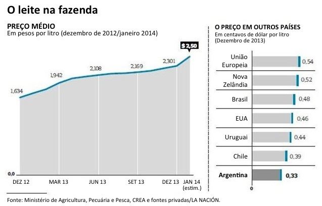 Os produtores de leite afirmam que seus preços ficaram defasados. Em dezembro passado, segundo o Ministério da Agricultura, o valor médio recebido pelos produtores foi de 2,301 pesos (US$ 0,2916). Hoje, de acordo com fontes privadas, estaria em uma faixa de 2,40 a 2,70 (US$ 0,3042 a US$ 0,3422), segundo as regiões.