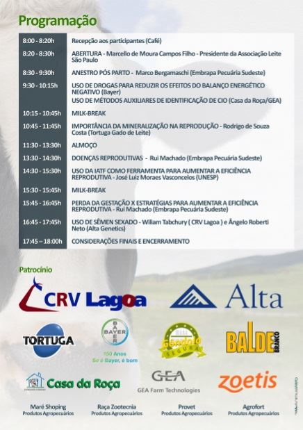 Especialistas nos vários aspectos envolvidos na eficiência reprodutiva farão palestras e discutirão com técnicos e produtores presentes, visando esclarecer os pontos chaves a serem observados para assegurar o sucesso na reprodução e maximizar a produção de leite.