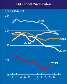 Os preços internacionais dos alimentos voltaram a subir em outubro, segundo a FAO, a Agência para Agricultura e Alimentação das Nações Unidas. O índice mensal da entidade, que mensura uma ampla cesta de alimentos, atingiu no mês passado 162 pontos, um aumento de 3,9% em relação a setembro. Segundo a FAO, a guinada se deveu ao fenômeno climático El Niño, que ameaça a oferta de algumas commodities.