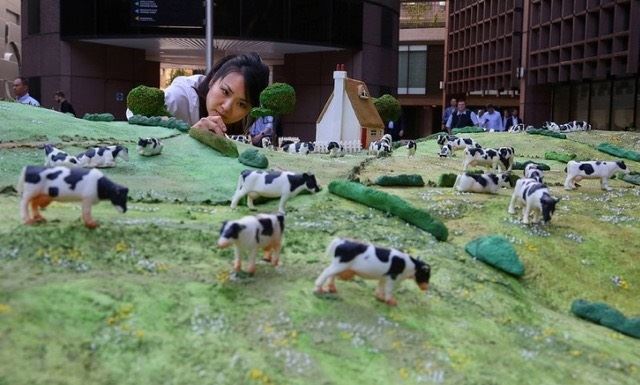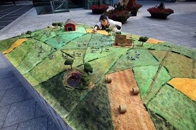 Esse elaborado elemento publicitário foi colocado na Finsbury Avenue Square, em Londres, na quarta-feira passada e o design – trazendo todos os detalhes do campo irlandês, incluindo uma casa de campo, um celeiro, árvores, um grupo de vacas, fardos de feno e até mesmo uma lagoa feito de geléia – foi escolhido para enfatizar a herança irlandesa da Kerrygold.
