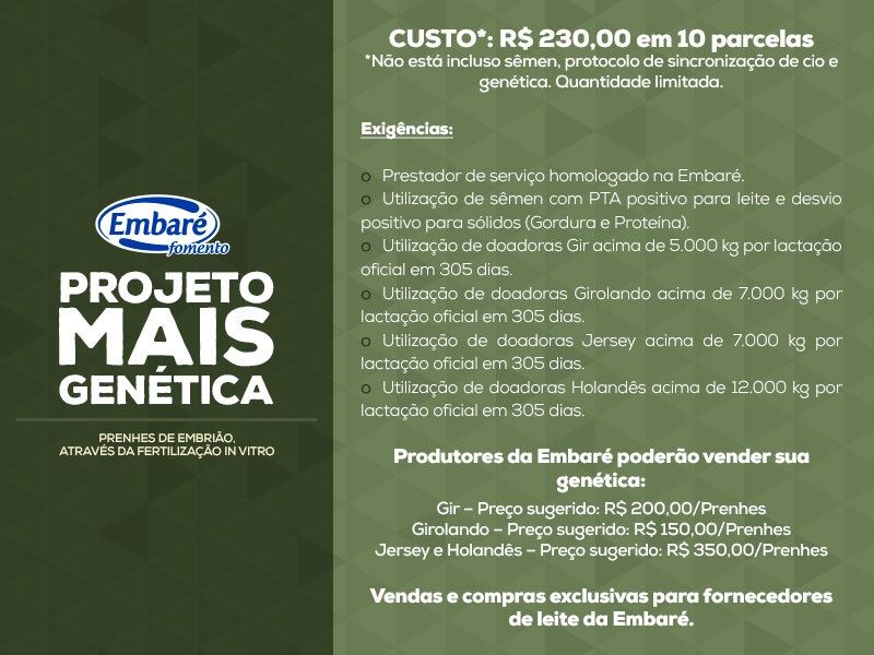 a) Programa Mais Genética – Mais de 4.500 fêmeas de FIV (fertilização in vitro) filhas de doadoras e sêmen de ponta.