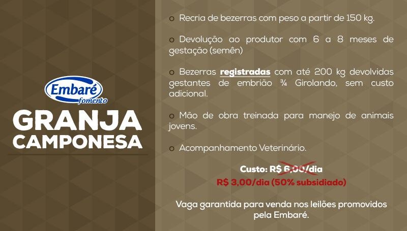 Ontem (28/04), a Embaré, situada em Lagoa da Prata, realizou seu 20° leilão de repasse de genética para seus fornecedores. O evento que aconteceu em Lagoa da Prata/MG, onde fica situada sua fábrica, contou com a presença de mais de 500 fornecedores, que puderam adquirir novilhas leiteiras paridas de uma oferta de 143 cabeças. O leilão também foi transmitido pela MF Rural onde apenas fornecedores da Embaré puderam adquirir animais. Além da Diretoria da Embaré, estava presente o Presidente da Associação da Raça Girolando.
