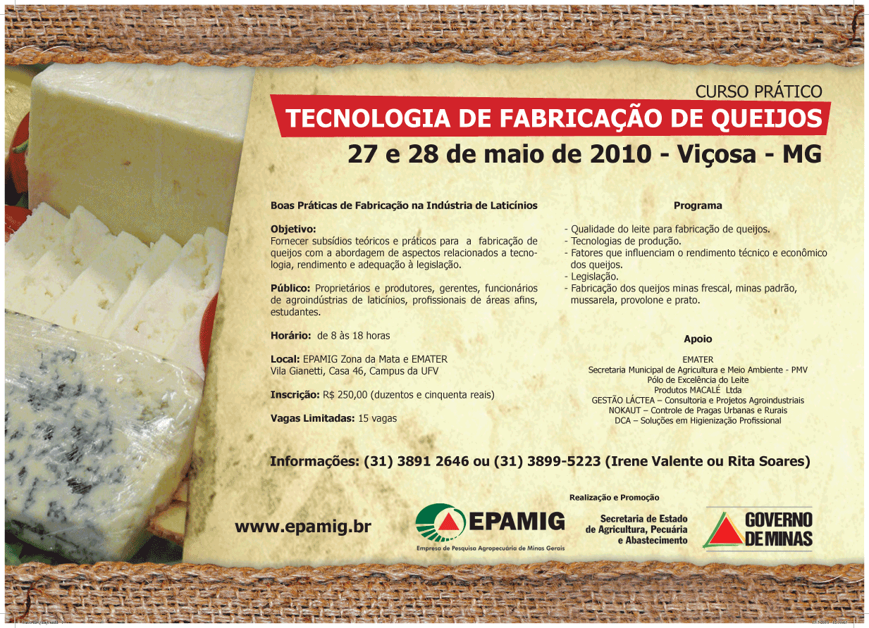Durante os dias 27 e 28 de Maio, em Viçosa/MG, será realizado o curso prático sobre "Tecnologia de Fabricação de Queijos". O objetivo do curso é fornecer subsídios técnicos e práticas para a fabricação de queijos com abordagem de aspectos relacionados à tecnologia, rendimento e adequação à legislação.