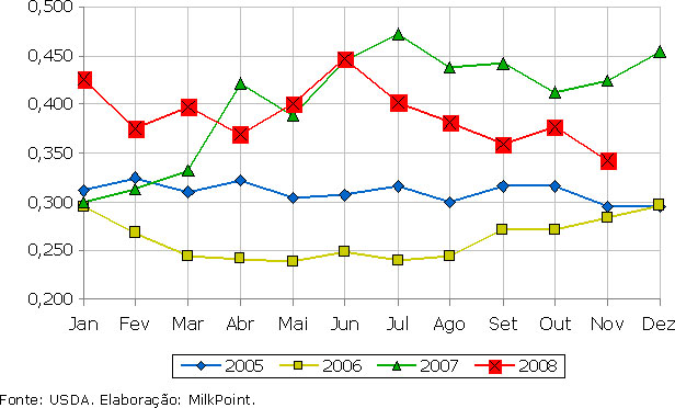 Segundo dados do Departamento de Agricultura dos Estados Unidos (USDA), o preço do leite classe III em novembro apresentou queda de cerca de 3 centavos por quilo, em relação a outubro, fechando em US$ 0,3419 por quilo, uma variação negativa de 9,08%. Em comparação a novembro de 2007, o preço pago pelo leite apresenta queda de 19,3%.