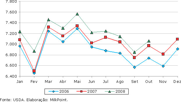 Em outubro, a produção de leite nos Estados Unidos, segundo o USDA, apresentou alta de 3,01% em relação ao mês anterior, somando 7.058 milhões de quilos. Em relação a outubro de 2007, o aumento na oferta foi de 1,2%.
