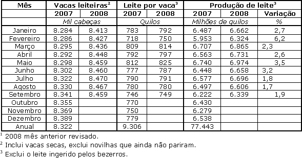 A produção de leite por vaca em setembro foi de 749,33 quilos, 3,175 quilos a mais que em setembro de 2007. O número de vacas leiteiras foi de 8,46 milhões de cabeças, 118 mil cabeças a mais que em setembro de 2007, mas 8 mil cabeças a menos que em agosto de 2008.