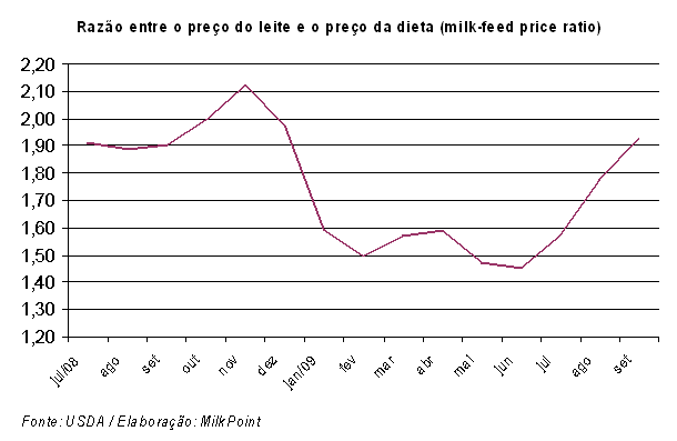 A melhora na razão de setembro ocorreu devido aos menores preços da dieta e aos maiores preços do leite. O preço do leite em setembro foi de US$ 0,2799 por quilo, 1,54 centavos a mais que no mês passado, mas US$ 0,1212 por quilo a menos que em setembro de 2008.