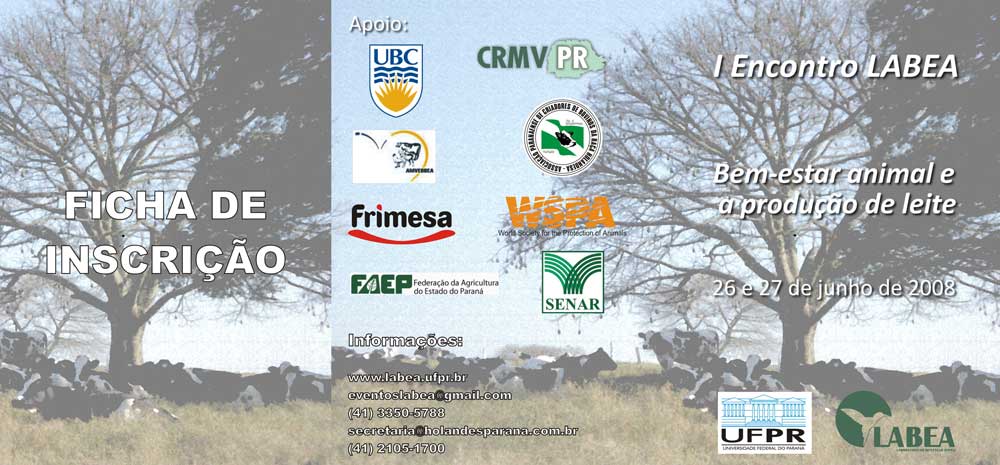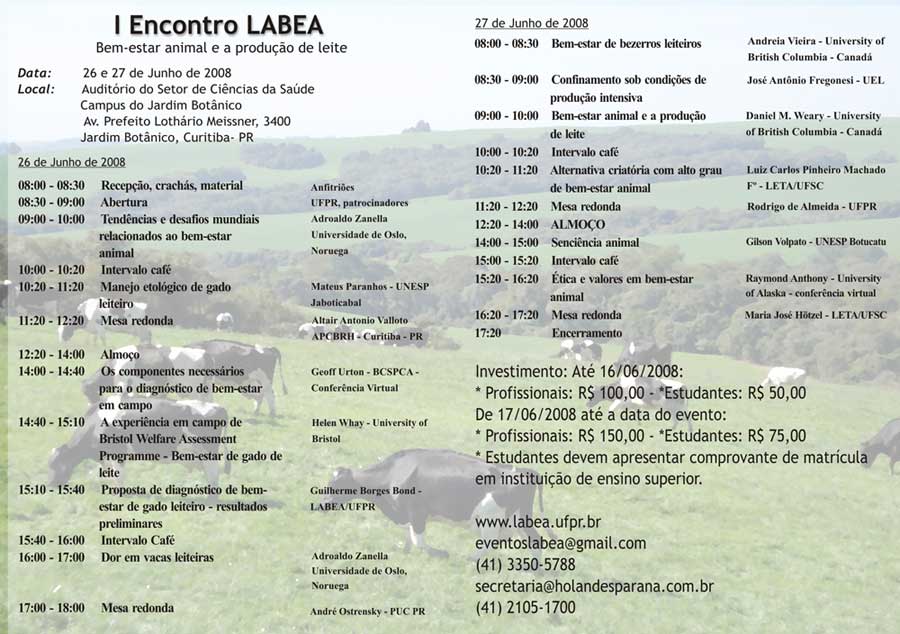 Para aprofundar a discussão de tais questões, a Universidade Federal do Paraná apresenta o I Encontro LABEA - Bem-Estar Animal e a Produção de Leite, evento que será realizado nos dias 26 e 27 de junho de 2008 em Curitiba-PR. Este encontro visa apresentar a técnicos de campo, produtores de leite e estudantes, as pesquisas mais recentes de grupos brasileiros e internacionais, especializados no estudo do bem-estar animal. Informações e inscrições para o e-mail eventoslabea@gmail.com ou pelo site www.labea.ufpr.br ou ainda pelo telefone (41) 3350-5788.