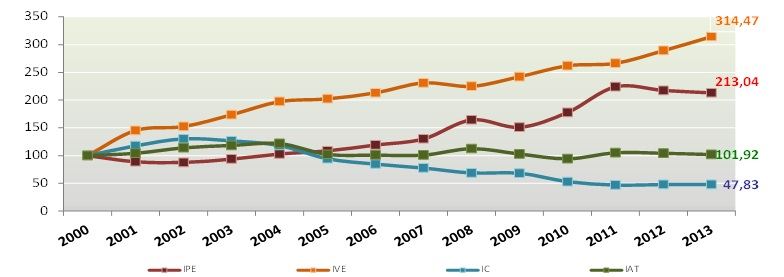 Figura 1 - Índice de Preços de Exportação do Agronegócio (IPE-Agro/Cepea) em dólar, Índice de Volume de Exportação do Agronegócio (IVE-Agro/Cepea), Índice de Atratividade das Exportações do Agronegócio (IAT-Agro/Cepea) e o Índice da Taxa de Câmbio Efetiva Real do Agronegócio (IC-Agro/Cepea). Dados anualizados. Para o ano de 2013, considera-se a média de janeiro até junho.