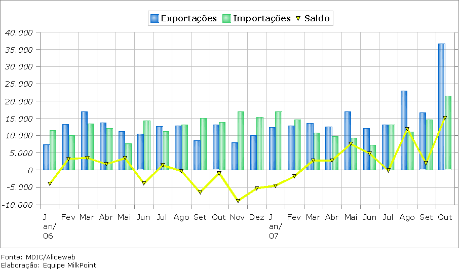 As exportações em outubro somaram 11,7 mil toneladas a US$ 36,7 milhões, o maior valor registrado na história das exportações de lácteos. Os números representam um aumento de 120% em volume e valor frente ao mês anterior. Em relação ao mesmo mês do ano passado, houve um acréscimo de 26% em volume e 180% em valor.