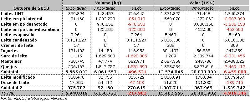 Tabela 1. Exportações e Importações de lácteos em outubro de 2010.