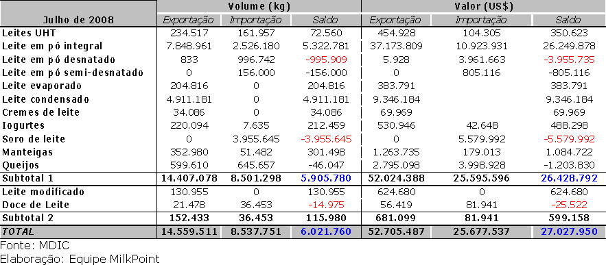 Tabela 1. Exportações e importações de lácteos em julho de 2008.
