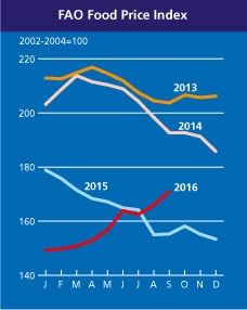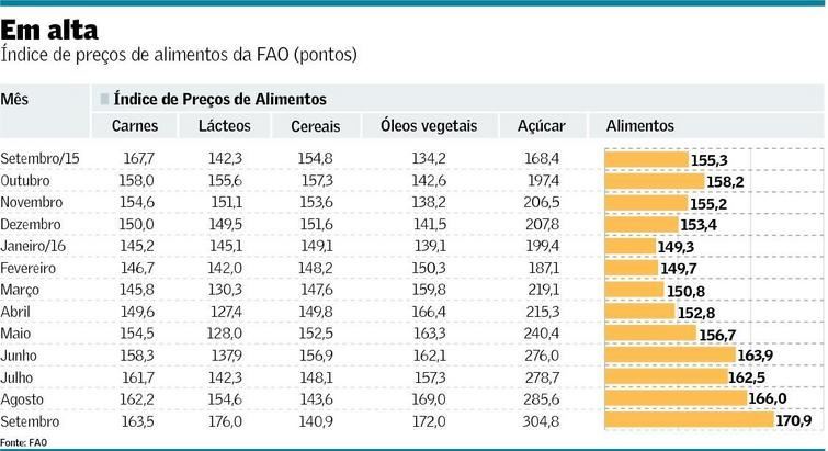 O salto foi impulsionado pelos preços dos produtos lácteos e açúcares. O primeiro subiu 13,8% em relação à agosto, devido ao aumento nas vendas de manteiga para a União Europeia, onde a produção de leite tem diminuído; já o açúcar aumentou 6,7% na mesma comparação, em consequência da menor produção no Brasil, por conta do clima mais desfavorável aos canaviais.
