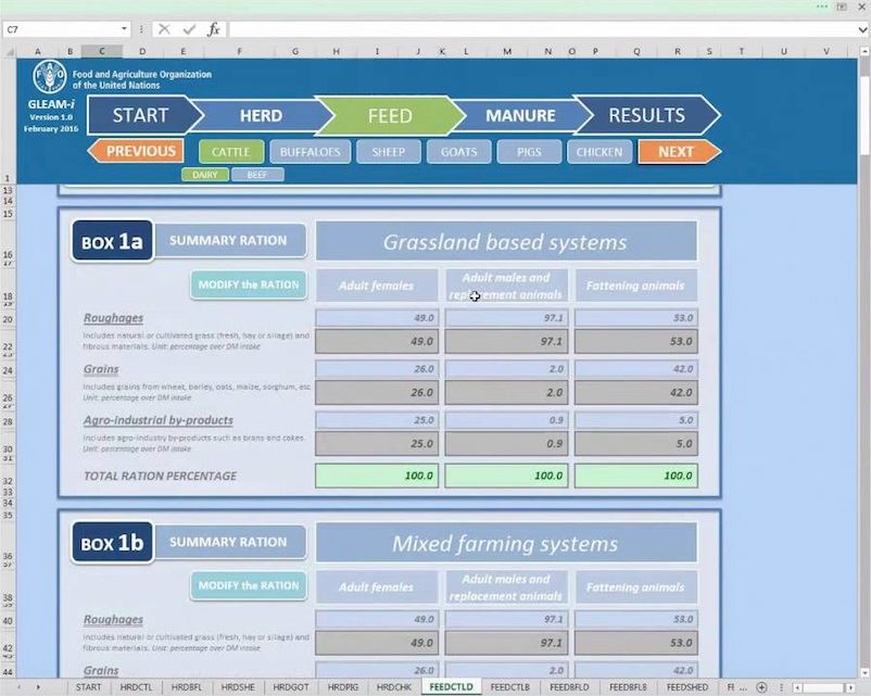 Baseado no GLEAM, modelo desenvolvido pela Divisão de Produção e Saúde Animal da FAO para dar suporte a políticas e mudanças práticas visando alcançar o desenvolvimento sustentável da pecuária, o GLEAM-i pode ser executado por qualquer pessoa usando o Excel, incluindo organizações comunitárias que trabalham em áreas rurais remotas. Ele inclui variáveis como países e regiões, números e tipos de animais – leiteiros ou de corte, a pasto ou confinados – materiais de alimentação animal, manejo de esterco, bem como condições específicas sob as quais os animais são mantidos.