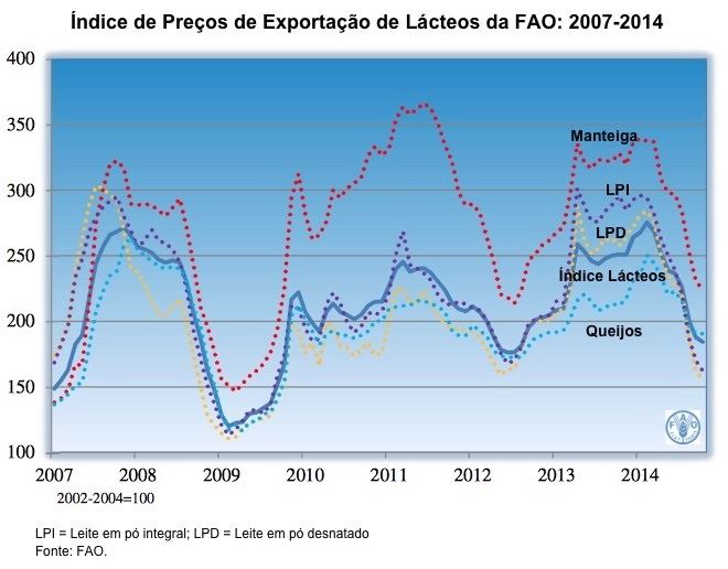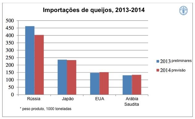 Inicialmente, os preços dos queijos não foram afetados como os outros produtos pelo declínio geral nos preços das commodities lácteas durante 2014; entretanto, após o anúncio do embargo da Rússia a países específicos, eles também caíram substancialmente, em 11,5% entre julho e outubro. Em termos de mercado total de queijos, o comércio, no entanto, deverá registrar crescimento em 2014, embora limitado, impulsionado pelas maiores importações em uma série de países, incluindo Estados Unidos, China, Coreia, Austrália e Egito, que mais que compensarão pela queda nas compras pela Rússia e pelo Japão.