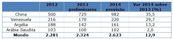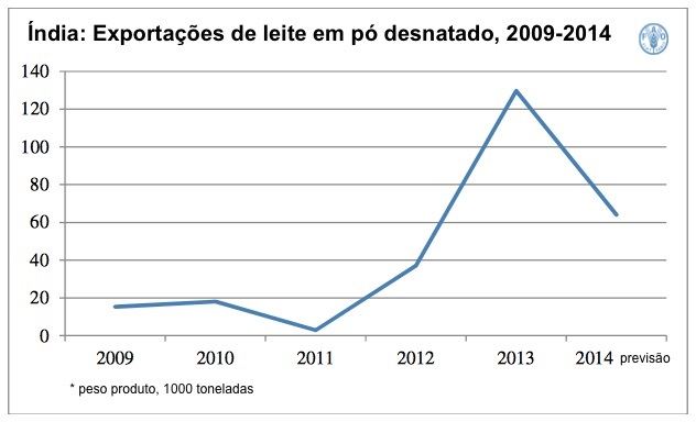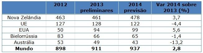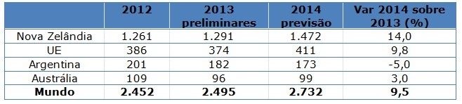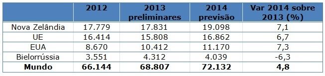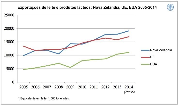 O comércio de produtos lácteos deverá aumentar em 4,8% em 2014, para 72,1 milhões de toneladas de leite equivalente. Os três principais países exportadores, Nova Zelândia, União Europeia (UE) e Estados Unidos, que juntos representam 65% do comércio, deverão registrar um aumento nas vendas de 6-7% em 2014.