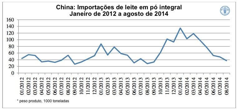 As exportações mundiais de leite em pó integral deverão aumentar em 9,5% em 2014, para 2,7 milhões de toneladas. Isso se compara com o crescimento limitado de 1,8% em 2013, quando uma queda na produção de leite restringiu o comércio. O mercado para leite em pó integral é muito diverso geograficamente, decorrente de sua ampla utilização na indústria de processamento e para vendas diretas no varejo. Uma série de exportadores principais incluindo Nova Zelândia, União Europeia (UE) e Austrália deverão aumentar os níveis de vendas para 2014 como um todo; entretanto, limitações de ofertas deverão reduzir as exportações da argentina. Os preços internacionais do leite em pó integral caíram profundamente entre abril e outubro, como resultado das maiores disponibilidades de exportação e estoques adequados na China, o principal mercado, após importações excepcionalmente de grande escala entre novembro de 2013 e março de 2014, visando se proteger contra uma possível escassez no leite doméstico. Subsequentemente, os importadores reduziram as compras à medida que mantiveram reserva adequada de produtos para suas demandas imediatas. Como resultado, as importações da China de leite em pó integral para 2014 foram provisoriamente estimadas para aumentar em 35% e poderiam alcançar 1 milhão de toneladas – representando 37% do comércio total. Em outros locais na Ásia, os menores preços estimularam a demanda em vários importantes mercados, incluindo Indonésia, Malásia, Coreia e Tailândia. Além disso, importadores na África do Norte e América Latina e Caribe, incluindo Argélia, Peru e Venezuela, retornaram mais plenamente ao mercado, enquanto no caso do Brasil, a maior produção doméstica deslocou as importações.