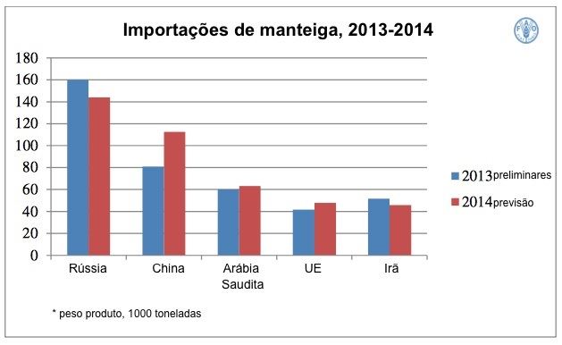 O comércio de manteiga deverá aumentar em 2,8%, para 937.000 toneladas. Os preços internacionais de manteiga enfraqueceram, afetados pelos preços do leite em pó e pelas incertezas sobre as vendas futuras à Rússia, principal mercado. A demanda por manteiga vem principalmente do sudeste da Ásia, Oriente Médio e Rússia, apesar de, assim como para outros produtos lácteos, a China tem aumentado substancialmente suas compras nos últimos anos. Além disso, como resultado dos acordos comerciais e acesso livre de tarifas para processamento interno (onde os produtos são importados sem tarifas para processamento adicional e exportações), a UE é um importante importador de manteiga (quarto lugar no ranking) e exportador (segundo lugar no ranking). Embora muitos dos principais mercados, como China, Arábia Saudita e Cingapura, devem manter ou aumentar as importações em 2014, o embargo às importações de algumas origens específicas pela Rússia levantou dúvidas sobre seu nível de compras pelo restante do ano e, como consequência, as importações para o ano como um todo podem declinar.