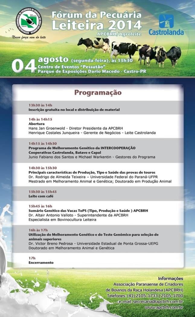 O Fórum da Pecuária Leiteira 2014 será realizado em agosto, no Parque de Exposições Dario Macedo, em Castro-PR [...]