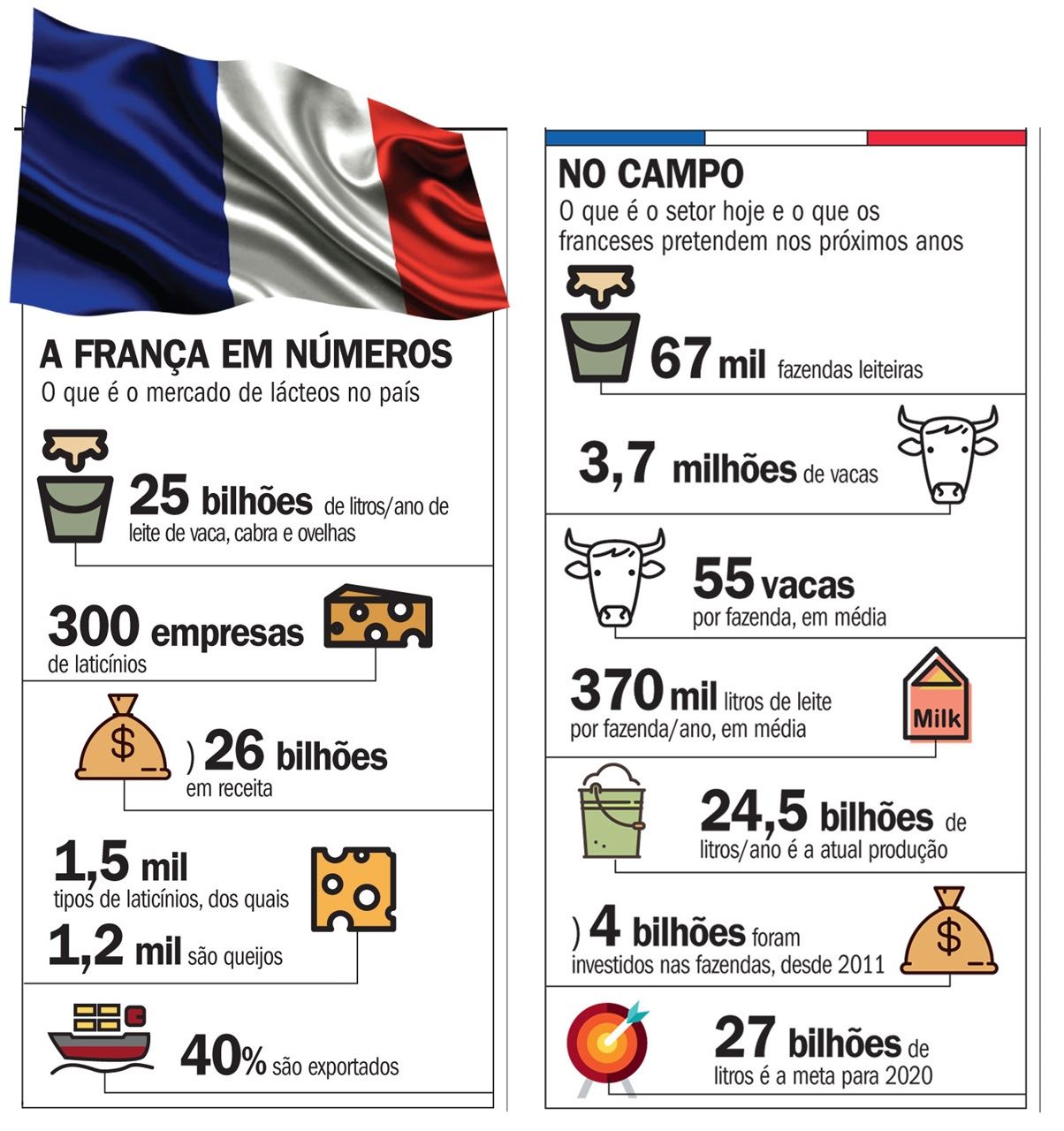 Aumentar a presença no mundo também é uma questão de sobrevivência para os produtores de leite da França e faz parte da estratégia de negócios dessa cadeia produtiva. Isso porque atualmente o país produz mais do que consome e está se preparando para produzir muito mais nos próximos anos. A meta do setor é chegar em 2020 processando anualmente até 27 bilhões de litros de leite de vaca. Atualmente são 24,5 bilhões de litros por ano. O volume extra, de cerca de três bilhões, devem ser dedicados exclusivamente à exportação.