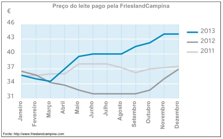 A companhia holandesa de lácteos, FrieslandCampina, informou que o preço garantido do leite cru para dezembro de 2013 será de 44 euros (US$ 59,71) por 100 quilos de leite, ou seja, o preço manteve o nível pago em novembro. O preço garantido se aplica para 100 quilos de leite com teor de gordura de 4,41% e um teor de proteína de 3,47%.