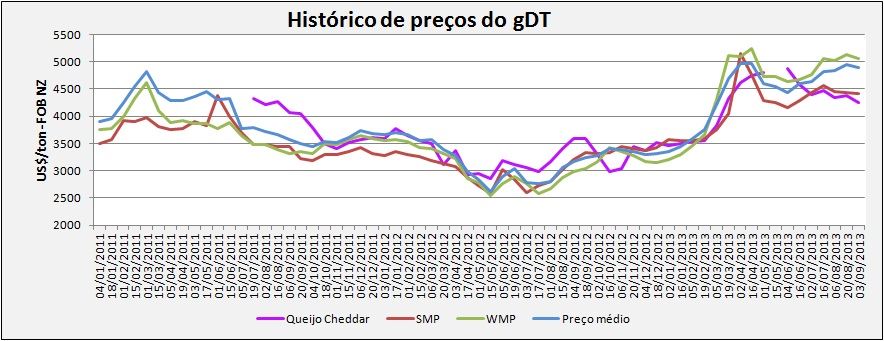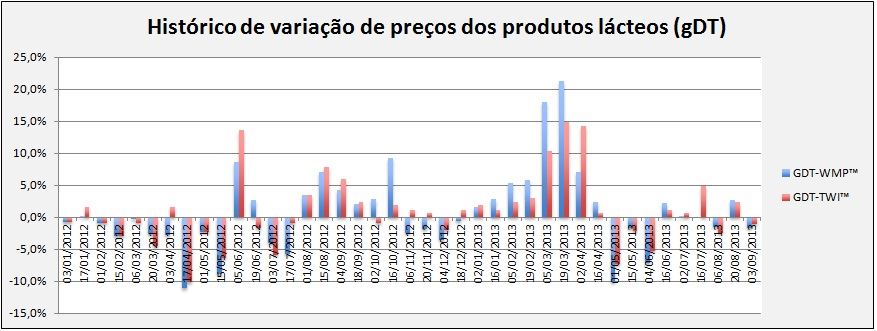 Gráfico 3: Histórico de variação de preços dos produtos lácteos (gDT)