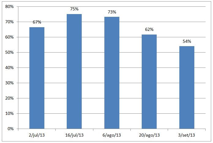 As cotações dos produtos lácteos continuam bem acima das observadas no mesmo período do ano passado. O preço médio dos lácteos está 54% maior que o observado na primeira quinzena de setembro de 2012. No entanto, esta diferença tem declinado desde o início do 2º semestre, como mostra o gráfico abaixo