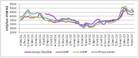 As cotações dos produtos lácteos continuam bem acima das observadas no mesmo período do ano passado. O preço médio dos lácteos está 51% maior que o observado no segundo leilão de junho de 2012. O leite em pó integral apresenta diferença maior ainda, sendo cotado a um preço 62% acima do observado no ano passado.