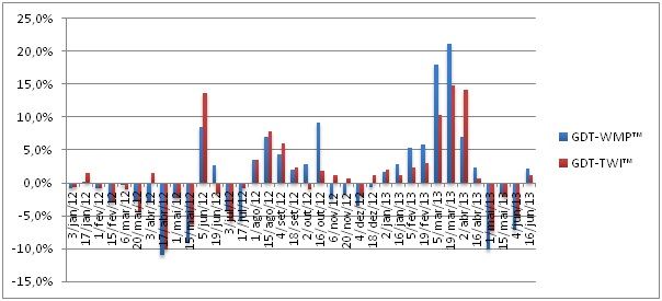 * Ressalta-se que o valor médio dos preços está relacionado aos preços dos contratos negociados no evento, enquanto o índice é uma média ponderada das variações percentuais dos preços dos produtos, e não dos níveis de preços. A variação no valor médio dos preços firmados no leilão não apresenta necessariamente a mesma variação do índice. O objetivo de usar o índice GDT é minimizar distorções no preço médio de vencimento dos contratos. Distorções que podem ser causadas por mudanças no volume demandado entre os produtos que compõem o índice, uma vez que os produtos apresentam diferenças significavas nos preços