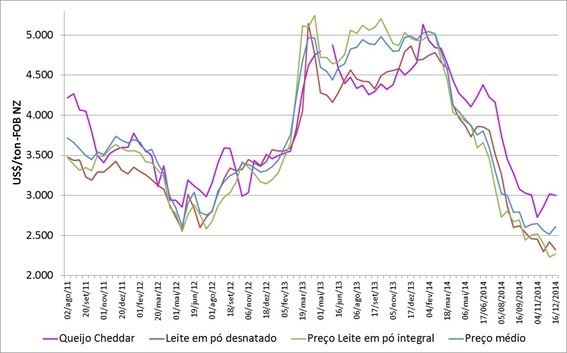 Os preços do leite em pó desnatado e queijo Cheddar tiveram pequena redução, fechando as cotações em US$2.320 e US$3.002,00 a tonelada, respectivamente.