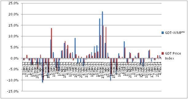 * Ressalta-se que o valor médio dos preços está relacionado aos preços dos contratos negociados no evento, enquanto o índice é uma média ponderada das variações percentuais dos preços dos produtos, e não dos níveis de preços. A variação no valor médio dos preços firmados no leilão não apresenta necessariamente a mesma variação do índice. O objetivo de usar o índice GDT é minimizar distorções no preço médio de vencimento dos contratos. Distorções que podem ser causadas por mudanças no volume demandado entre os produtos que compõem o índice, uma vez que os produtos apresentam diferenças significavas nos preços.
