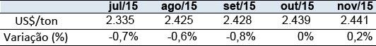Os contratos para entrega futura de leite em pó integral também apresentaram redução nos valores em relação ao último leilão para a maioria dos meses disponíveis, como pode ser visto na tabela abaixo. Os valores projetados ficaram em torno de US$2.400/ tonelada, indicando que os preços de lácteos devem permanecer baixos ao longo de 2015.