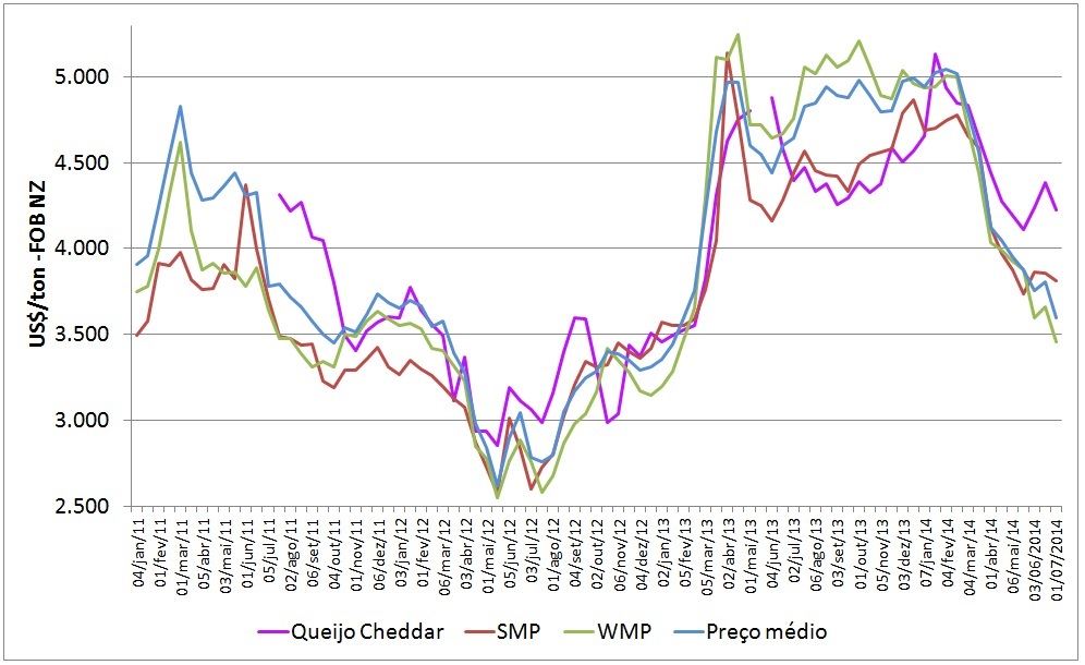 A queda nos valores comercializados deveu-se principalmente à redução dos preços do leite em pó integral ( -5,4% de acordo com o índice GDT-WMP), que foi cotado a US$ 3.459/tonelada, e do queijo cheddar (-2,9% de acordo com o índice GDT-Cheese), cotado a US$ 4.226/tonelada.