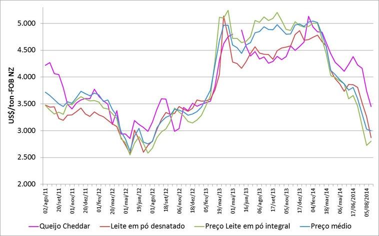 As reduções mais significativas estão nos preços do leite em pó desnatado (-12%, de acordo com o índice GDT-SMP) e no queijo Cheddar (-7,9% de acordo com o índice GDT-Cheese), ficando com as cotações médias, respectivamente, de US$2.874 por tonelada e US$3.453 por tonelada. O leite em pó integral, contudo, apresentou pequena reação nos preços (+3,4% - índice GDT-WMP), fechando em US$2.804 a tonelada.