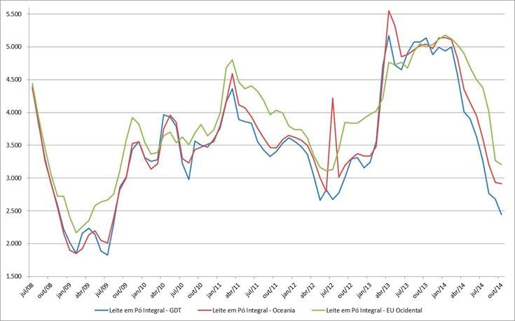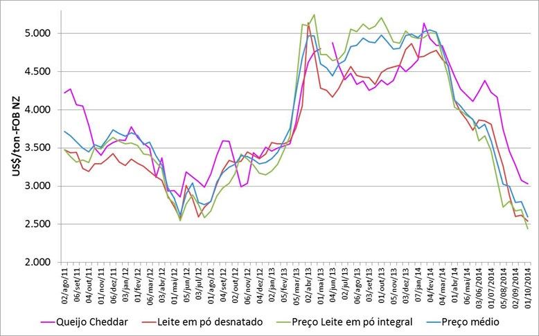 As cotações cada vez mais baixas resultam das variáveis de oferta e demanda. Do lado da oferta, a Nova Zelândia (que representa em torno de 50% das exportações mundiais), está mantendo os patamares de produção acima do ano anterior, com um acumulado até julho de 16% de aumento, enquanto os Estados Unidos estão com aumento de 1,7% de produção (acumulado até agosto) e a União Europeia com 5,3% de aumento (acumulado até julho).