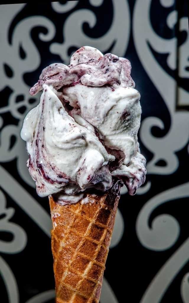 Sorvete de iogurte feito com kefir e misturado a jabuticaba, da Gelato Boutique