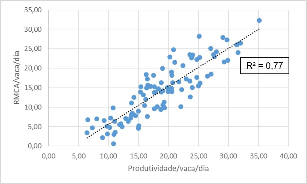 Gráfico 1. RMCA vs. produção de leite (litros/vaca em lactação/dia).