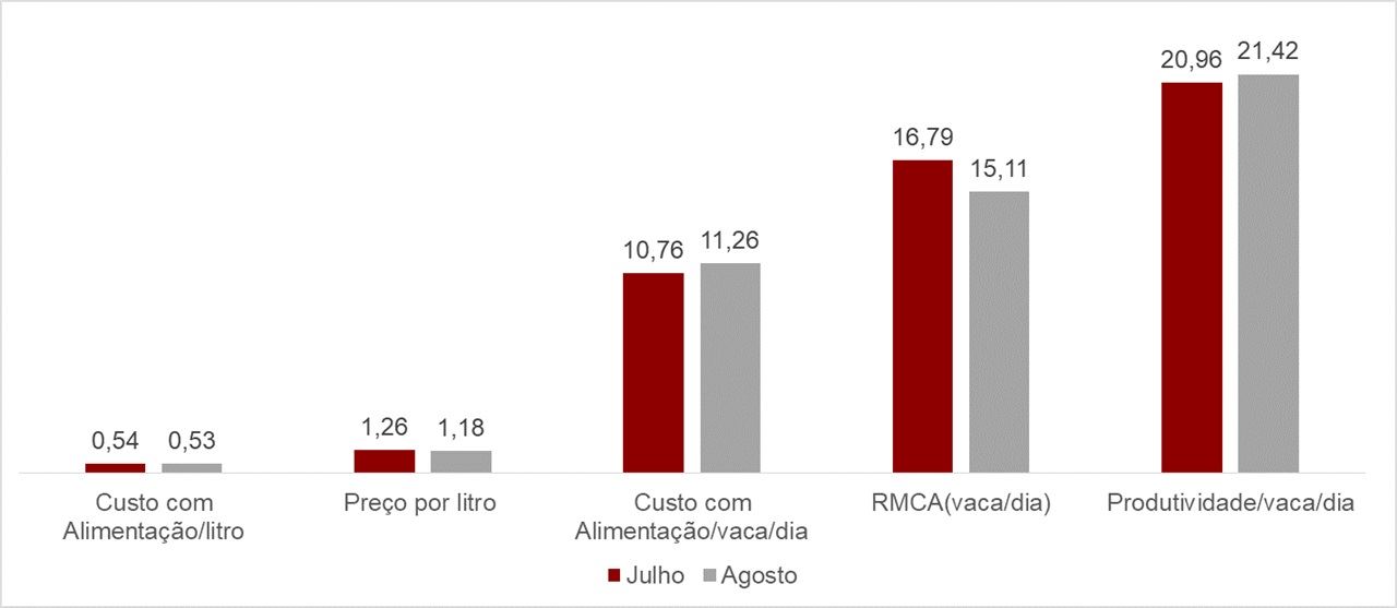 O que levou à queda na RMCA entre estes 2 meses foi o recuo nos preços do leite. Considerando preço igual nos dois meses, a maior produtividade por vaca teria levado a um aumento do parâmetro, mesmo com a elevação nos custos de alimentação.