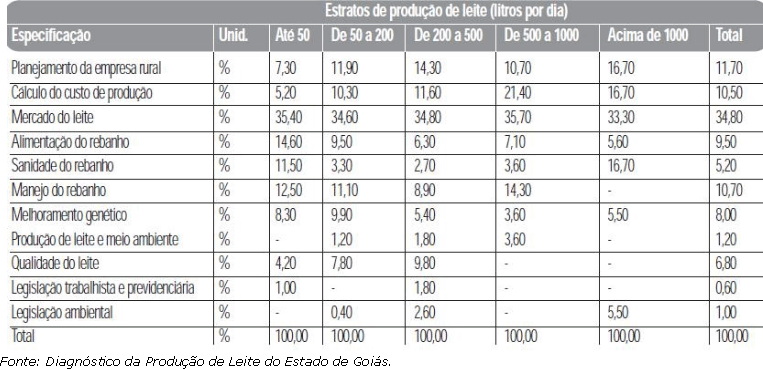 Também na lista das informações dadas pelos entrevistados, a maior carência citada era sobre mercado do leite, 34,80%, vindo, a seguir, planejamento da empresa rural, segundo 11,70% dos entrevistados (Tabela 1). Portanto, praticamente a metade dos entrevistados afirmou que suas maiores carências eram relativas à economia na produção de leite.