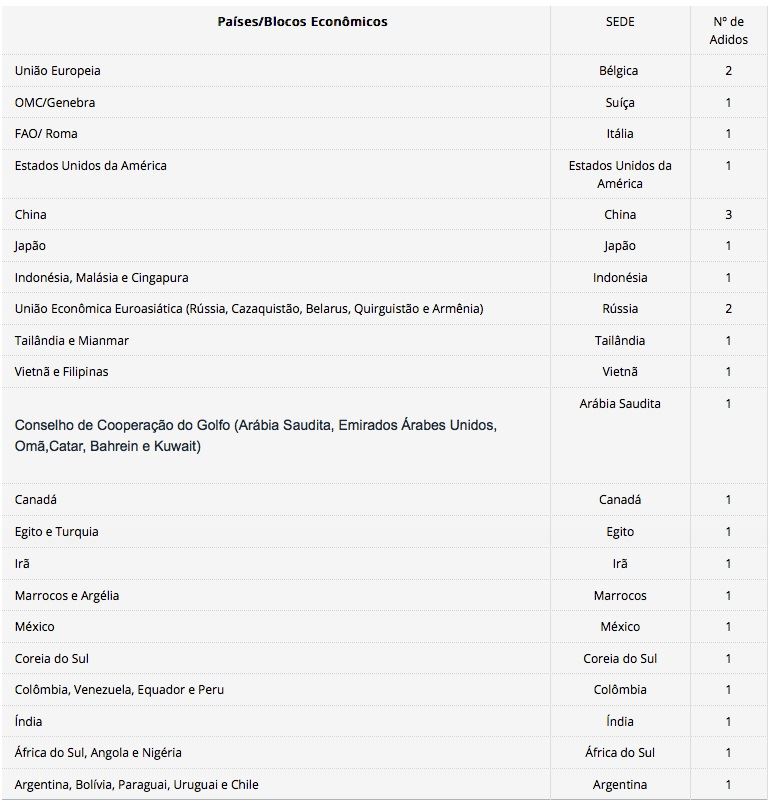 Segundo a coordenadora-geral de Atuação dos Adidos Agrícolas do Ministério da Agricultura, Pecuária e Abastecimento (Mapa), Edilene Cambraia Soares, os países definidos na portaria para ter postos de adidos agrícolas são os principais importadores de alimentos do mundo. “A nossa presença nos países da Ásia, Oriente Médio e América confirmam a importância desses mercados no comércio agrícola brasileiro e nas relações bilaterais.”