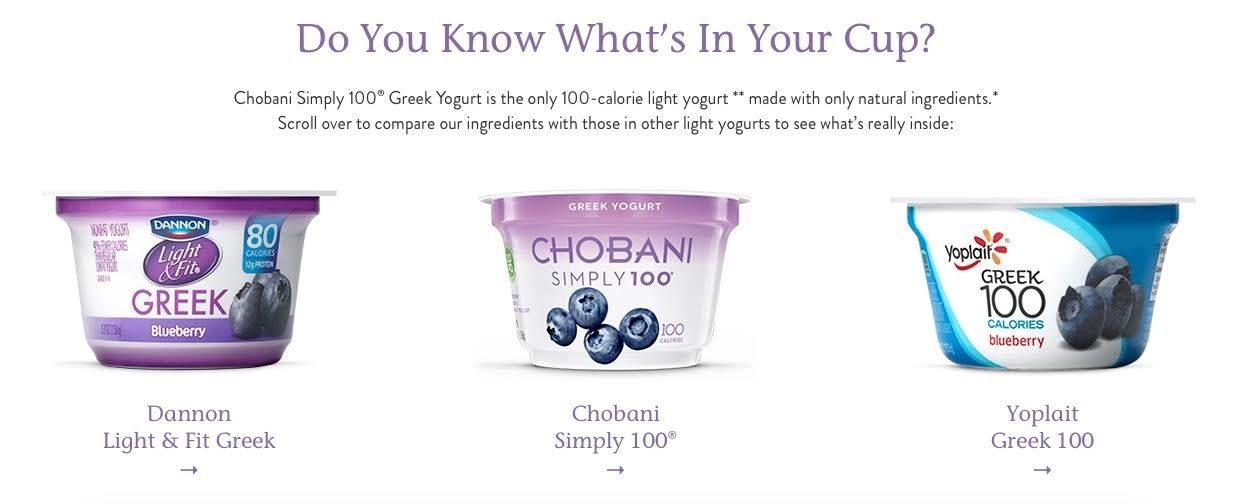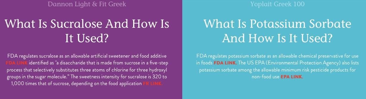 A sucralose é um adoçante artificial popular e o sorbato de potássio é um conservante amplamente usado. Ambos são considerados seguros para uso em alimentos pela Administração de Alimentos e Medicamentos (FDA) dos Estados Unidos. A Dannon afirma que a campanha da Chobani é enganosa, presumivelmente porque assusta os consumidores com relação a ingredientes que o governo diz que são adequados para o consumo.