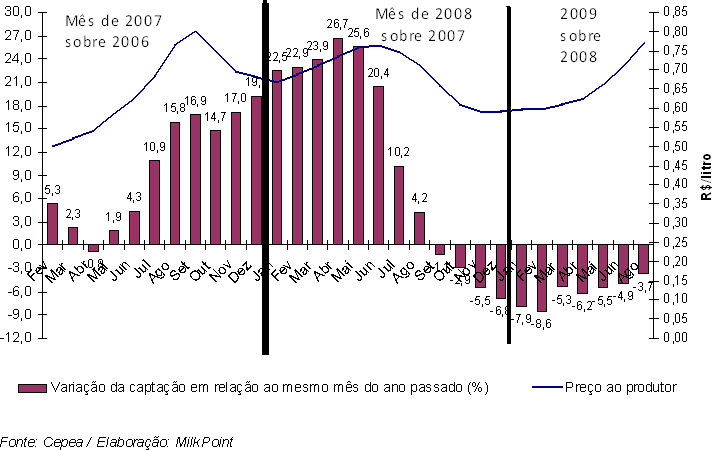 Gráfico 1. Variação da captação em relação ao ano anterior e preço pago ao produtor (Cepea-Esalq-USP).