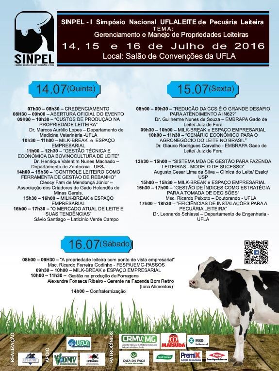 I Simpósio Nacional UFLALEITE de pecuária leiteira - SINPEL, nos dias 14, 15 e 16 de Julho de 2016, no Salão de Convenções da UFLA, cujo tema será