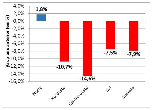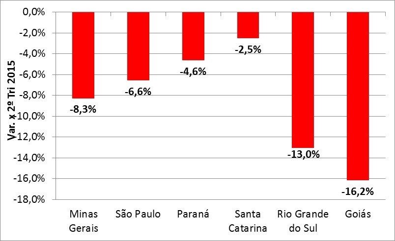 Em relação a este mesmo trimestre de 2015, as quedas foram de -8,3% em Minas Gerais, -6,6% em São Paulo, -4,6% no Paraná, -2,5% em Santa Catarina, -13% no Rio Grande do Sul e -16,2% em Goiás.