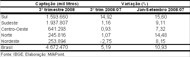 Em relação ao mesmo trimestre do ano anterior, o maior aumento foi observado na região Sul (14,9%), sendo que no Paraná o aumento da aquisição de leite foi 21,9% superior ao mesmo período de 2007, seguido de Santa Catarina (17,9%) e Rio Grande do Sul (9,8%). Estes três estados captaram 206,897 milhões de litros de leite a mais neste trimestre de 2008 em relação a 2007.