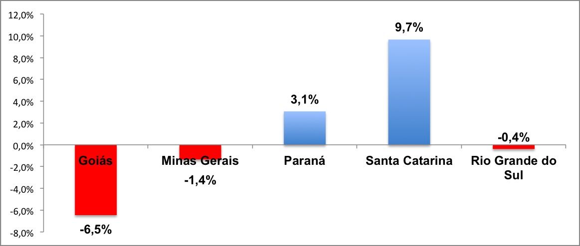 O gráfico abaixo traz a variação na captação dos principais estados com relação ao primeiro trimestre de 2014, mostrando a queda na captação de Goiás (-6,5%), Minas Gerais (-1,4%) e Rio Grande do Sul (-0,4%). Já no Paraná e em Santa Catarina, houve aumento na captação de, respectivamente, 3,1% e 9,7%.
