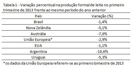 A Tabela 1 nos mostra a variação percentual da produção/captação de leite do 1º trimestre de 2013 de diversos países em comparação ao mesmo período do ano anterior.
